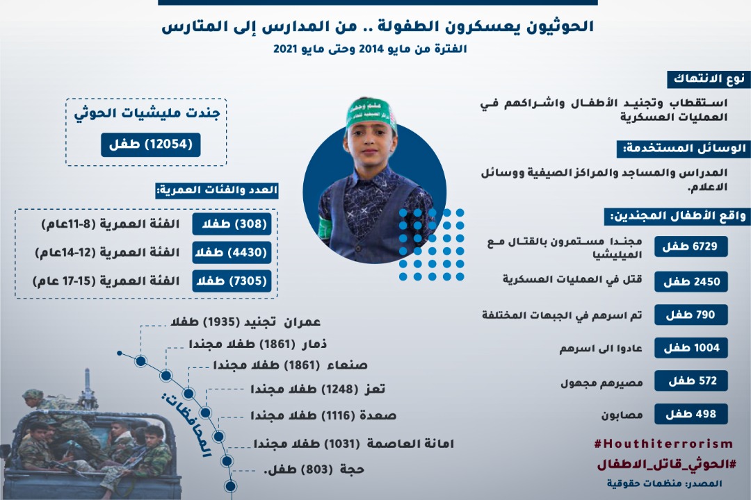 وحسب تقارير منظمات حقوقية انه خلال الفترة من مايو 2014 وحتى مايو 2021 جندت مليشات الحوثي عدد (12054) طفل بينهم عدد (308) طفلا مجندا ينتمون للفئة العمرية (8-11عام) وعدد (4430) طفل ينتمون للفئة العمرية (12-14عام) وعدد (7305) طفل ينتمون للفئة العمرية (15-17 عام).