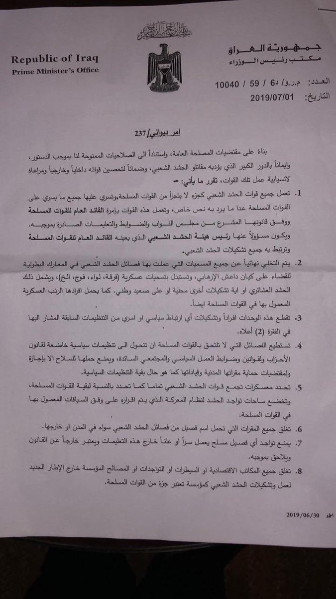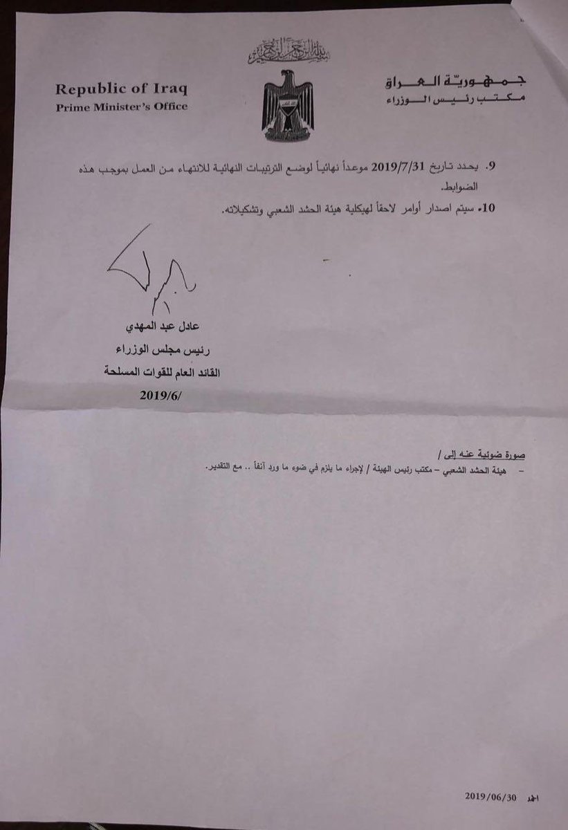 أصدر رئيس الوزراء العراقي، وهو القائد العام للقوات المسلحة، عادل عبد المهدي، الاثنين، أمراً خاصاً بالحشد الشعبي.