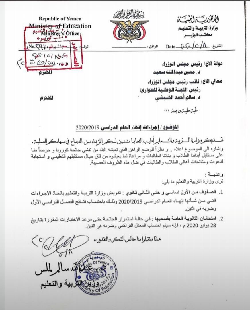 وتضمنت المذكرة المرفوعة من وزير التربية والتعليم الدكتور عبدالله لملس ،إلى رئيس الوزراء ونائبه، السبت، تضمنت مقترح بالإجراءات التالية: