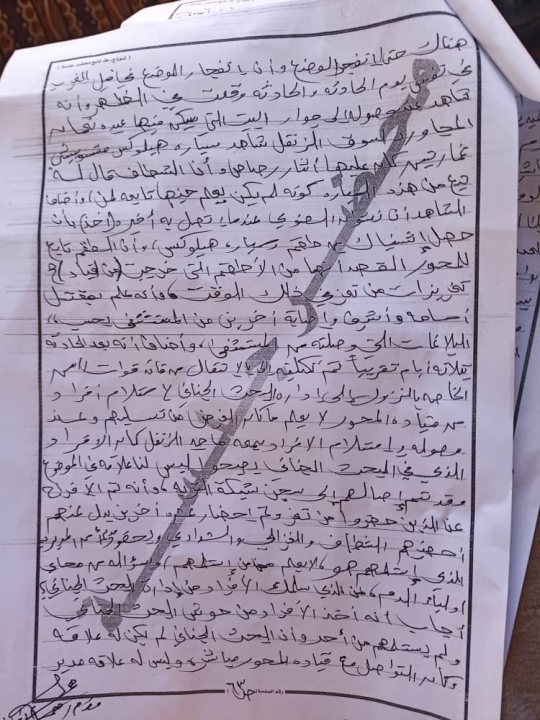 وقال: “بعد ثلاثة أيام، تم تكليفي من قبل قائد قوات الأمن الخاصة بالنزول إلى إدارة البحث الجنائي لاستلام أفراد من قيادة المحور، ولم يكن لي علم بالغرض من تسليمهم، وعند وصولي لاستلام الأفراد، بمعية ماجد الزنقل، كان الأفراد الذين في البحث الجنائي يصيحوا: “ليس لنا علاقة في الموضوع”. وعندما تم تسليمهم لنا رفضوا الإدلاء بأسمائهم”.