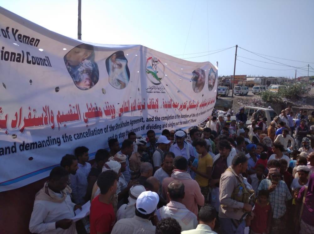 طالب المشاركون في الوقفة الاحتجاجية، التي نفذت الخميس، في مدينة الخوخة، الأمم المتحدة بإلغاء اتفاقية ستوكهولم، والتحالف العربي باستكمال تحرير الحديدة.